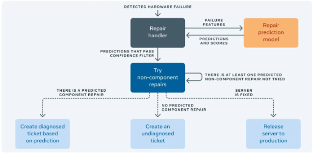 페이스북은 과거에 고장이 어떻게 수리되었는지 학습하고 현재 진단되지 않았거나 잘못 진단된 수리 티켓에 대해 어떤 수리가 필요한지 예측하는 머신 러닝 프레임워크를 구축했습니다. 부정확하고 정확한 예측의 비용과 이점을 바탕으로 각 수리 작업에 대한 예측 신뢰도에 임계값을 할당하고 수리 작업의 순서를 최적화합니다.